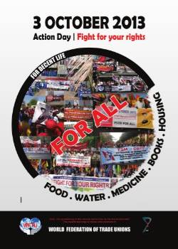Κάλεσμα στα μέλη της, στα ταξικά προσανατολισμένα συνδικάτα, στις συνδικαλιστικές οργανώσεις σε όλες τις ηπείρους, στους εργαζόμενους και τη νεολαία απευθύνει η Παγκόσμια Συνδικαλιστική Ομοσπονδία (ΠΣΟ). Η ΠΣΟ έχει καθιερώσει την 3η Οκτώβρη ως Μέρα Διεθνούς Δράσης, στα πλαίσια της οποίας πρόκειται να οργανωθούν εκατοντάδες διαδηλώσεις, κινητοποιήσεις, απεργίες και άλλες δραστηριότητες σε κάθε γωνιά του κόσμου, με αιχμή φέτος το αίτημα για τροφή, νερό, βιβλία, φάρμακα και στέγαση για όλους.